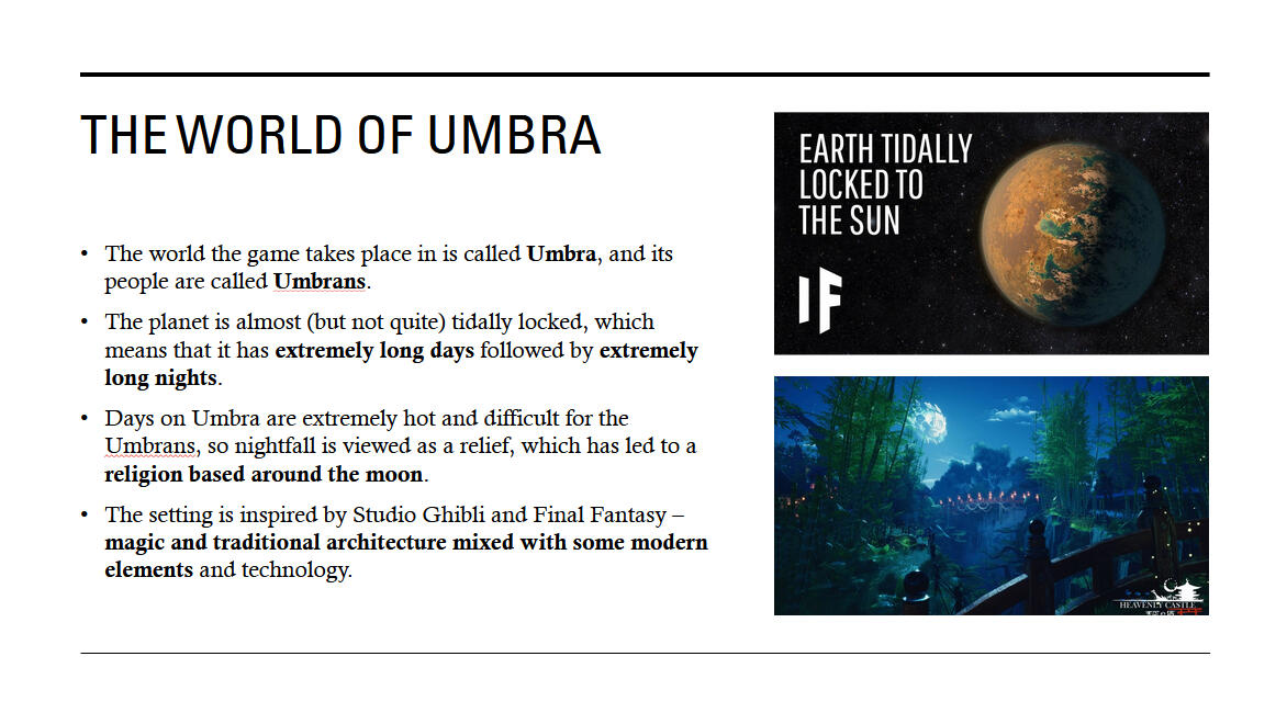 Our first Unreal game project at Futuregames became Luna: Shepherd of Souls, a game about traveling through a beautiful post-apocalyptic world, learning about the fates of the people who once lived there, and using your power to quite literally move the moon to stay in its light.As this was a story-driven game, I happily took on the role of narrative designer. A significant amount of work went into pre-production, during which we established the world's lore and the player's role in it. I prepared a "lore bible" and presented it as a narrative brief to the team.We'd decided early on that we wanted full voice acting for the game, so I wrote the dialogue and the voice direction for our four characters and worked with our programmers to implement it into the game. Much of it was told through cutscenes, and I created the level sequences that drove those cutscenes, something I'd never tried before. One of my favorite things about this was working closely with the level designers to create "quests" for each of their sections.This was a hugely ambitious project for the time frame, and although we didn't achieve all the goals we set out to accomplish, what we built together in these few was definitely special in its own right.