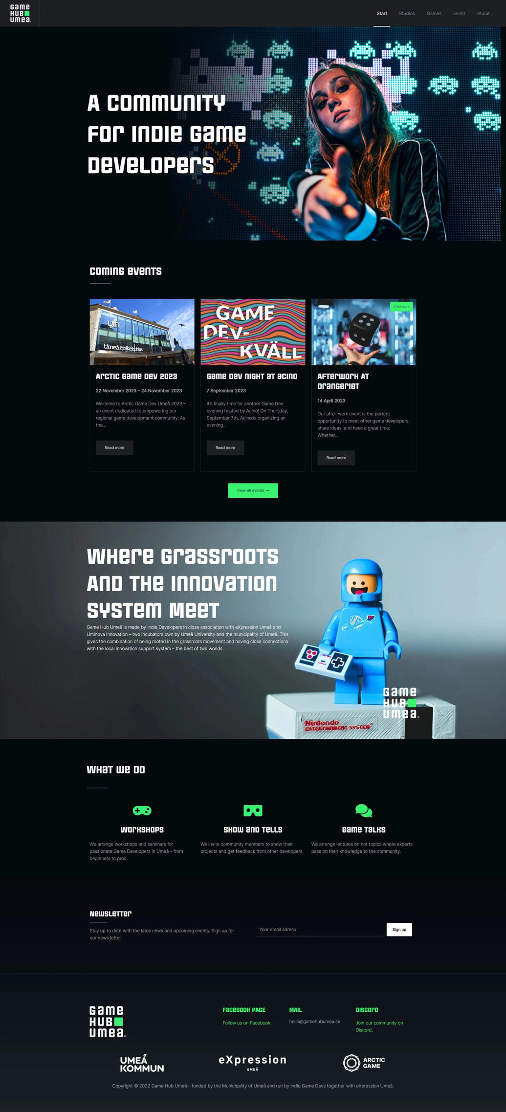 Game Hub Umeå (GHU) is the name of a game developer community started by Uminova Innovation and later given into the care of eXpression Umeå and Umeå Kommun Näringsliv, who hired me to foster and promote local game development in the Umeå region.I had two different roles in this position. As the community manager of GHU I organized events for the local game developer community (game jams, playtesting, afterwork, etc), ran the Discord server (which grew to 350+ members in my time there) and worked together with schools and the university to promote local game development.In my role as the local representative for Arctic Game, I focused on meeting with the city's studios, finding out what they needed from the municipality, and helped lay the foundation for what is now called We Make Realms. I also collaborated with other gaming clusters from across Sweden in bi-weekly peer reviews, and worked tightly with Umeå Kommun Näringsliv to plan for the future of the region's games industry.